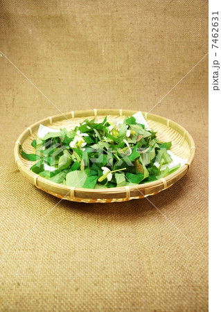 健康茶素材・笊に花の時期のドクダミ・カットなし白バック縦位置俯瞰