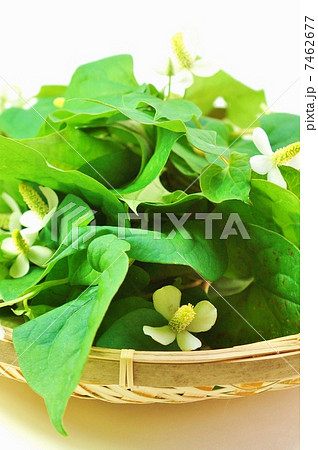 健康茶素材・笊に花の時期のドクダミ・カットなし白バック縦位置