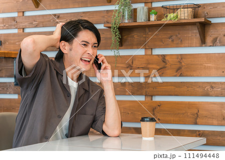 カフェで電話する若いアジア人男性(うっかりミス・ヒューマンエラー)