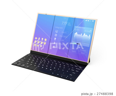 折りたたみ式スマートフォンが展開され、キーボードにドッキングしてノートパソコンのように利用する