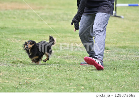 ドッグランで遊ぶダックスと女性