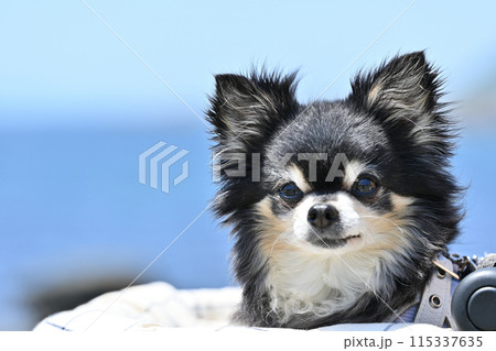 爽やかな青空と海 笑顔が可愛いシニアチワワ