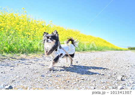 キバナコスモスの咲く通路で笑顔でキメポーズのチワワ 埼玉県鴻巣市 吹上コスモス畑