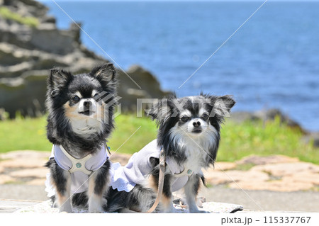 爽やかな青空と青い海 笑顔の仲良しチワワ