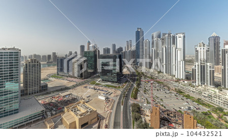 Skyscrapers at the Business Bay aerial all day timelapse in Dubai, United Arab Emirates