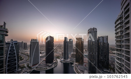 Tall residential buildings at JLT aerial night to day timelapse, part of the Dubai multi commodities centre mixed-use district.