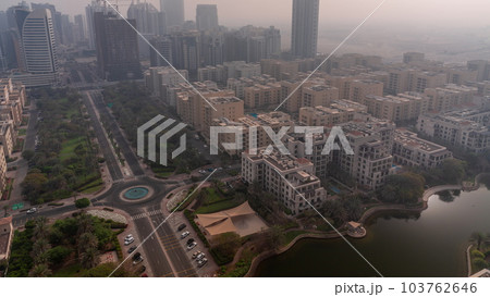 Skyscrapers in Barsha Heights district and low rise buildings in Greens district aerial timelapse during sunrise.