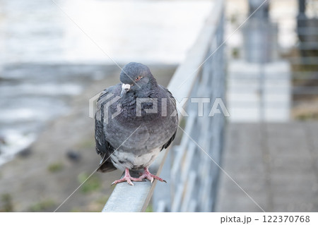 手すりに止まるハト 大阪市土佐堀川 中之島公園