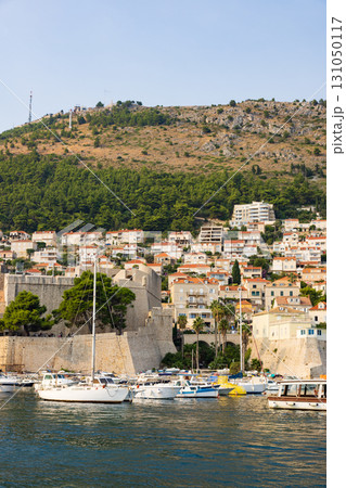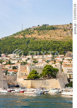 ヨーロッパ、クロアチアのドゥブロヴニクの城壁から見た港の景色