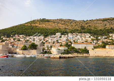 ヨーロッパ、クロアチアのドゥブロヴニク旧市街の城壁から見たスルジ山と港の景色