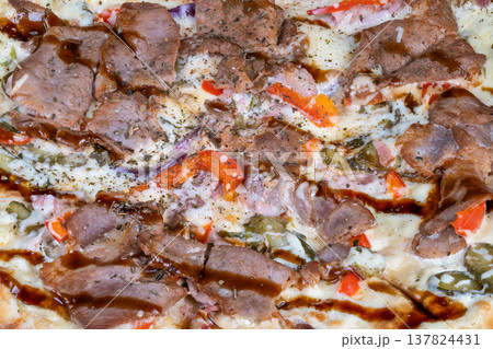 Gourmet toppings on pizza. Flavorful pizza with mix of savory meats and fresh vegetables. Exquisite pizza options loaded with variety of tasty meats and vibrant vegetables