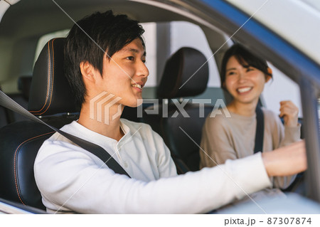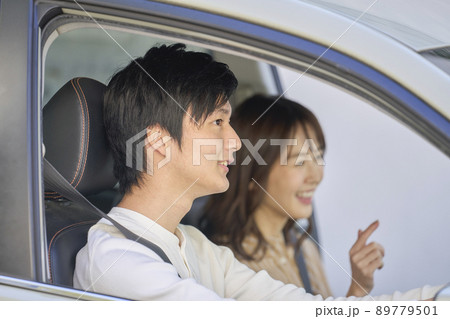ドライブ中に楽しそうに会話する若いカップル,夫婦