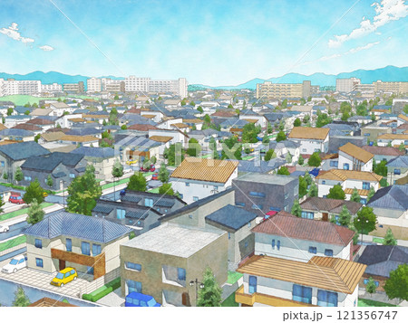 家 住宅 街 都市 手描き風 BG 水彩画風