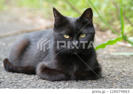 庭の前にいる一匹の黒猫