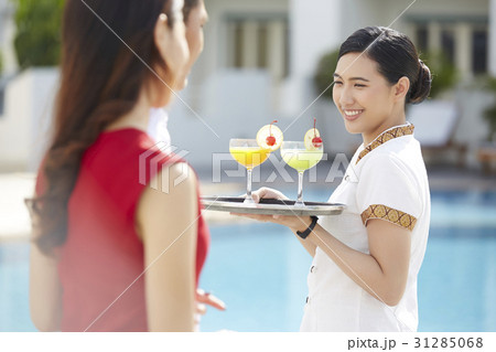 The waitress is serving drinks for couple sitting on a lounger