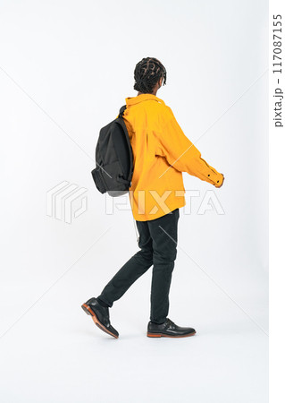 歩く黒人男性の後ろ姿の全身写真
