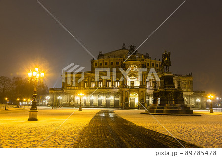 ドイツ 夜のドレスデンの旧市街の劇場広場に建つゼンパー・オーパーとヨハン王の像