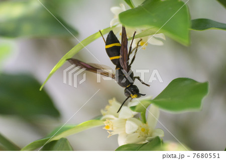 休息する狩り蜂 オオカバフスジドロバチ♀