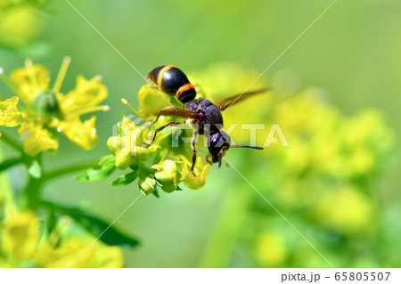 生き物 昆虫 ミカドドロバチ、一センチ前後の小さなハチ。黄色い鼻(頭盾)はオスの目印