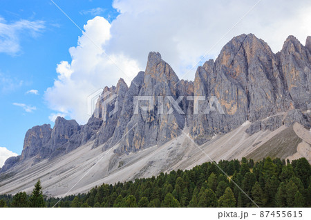 北イタリア ドロミテ地方 山小屋から見上げるガイスラー山群