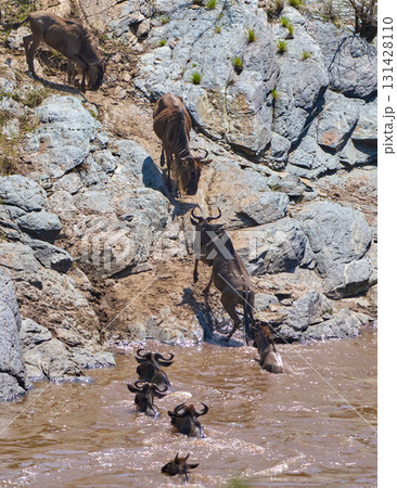 ヌーの群れが川を渡る大移動の瞬間(マサイマラ)