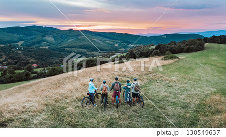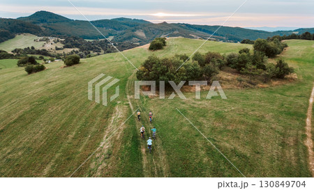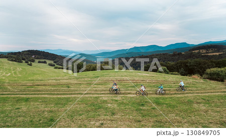 Areal view of multigenerational biking trip in nature.