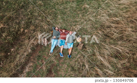 Areal view of grandfather, father and teen boy lying in grass and resting during hiking trip.