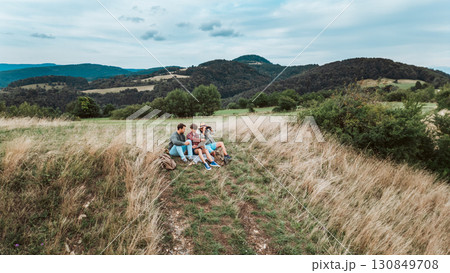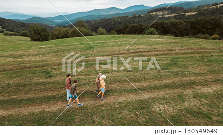 Aerial view of multigenerational family on hiking trip in nature.