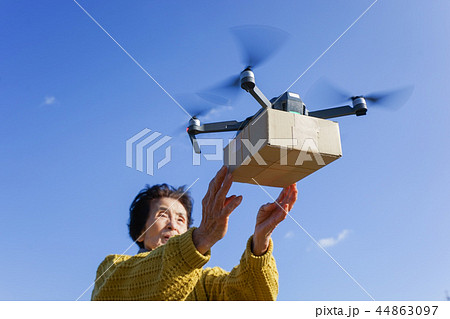 ドローンで荷物を受け取るシニア女性