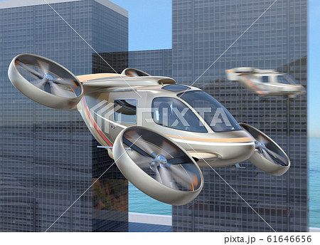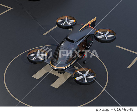 ヘリポートから自動運転ドローンタクシーが離着陸している。空飛ぶタクシーのコンセプト