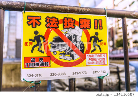 日本の横浜都市景観 師走。横浜駅前。「不法投棄」はダメ…奥は、ビックカメラや横浜ビブレ、南幸橋