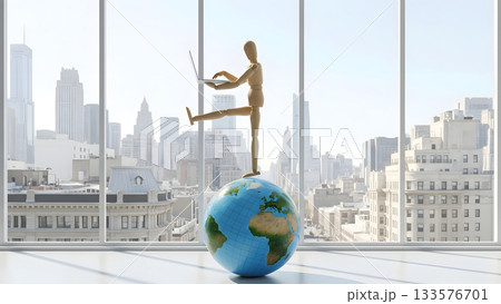 地球儀のバランスボールに乗り仕事をするデッサン人形