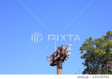 抜けるような青空にそびえ立つ野球場の大型照明塔(ナイター設備)