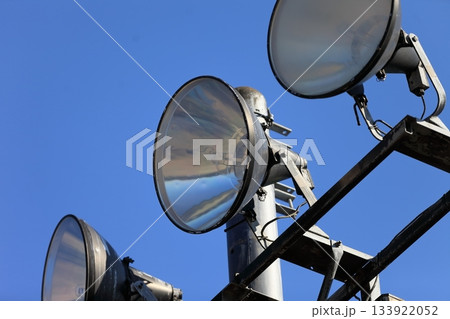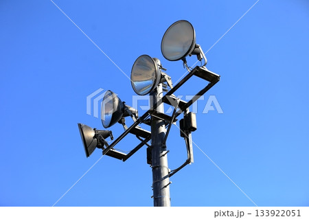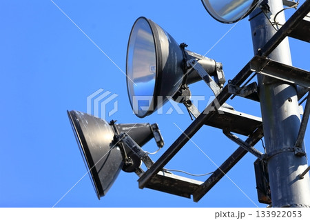 青空を背景にした照明塔とスピーカー|夢の島野球場