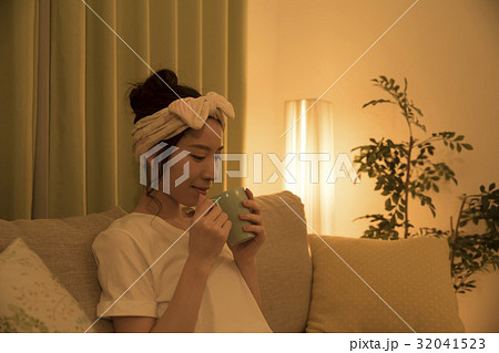 夜お茶をのむ若い女性