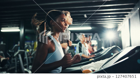 Fitness, woman and running on treadmill in gym at night for agility training, speed development or calorie burning. Flare, evening workout or girl on machine for cardio exercise or muscle performance