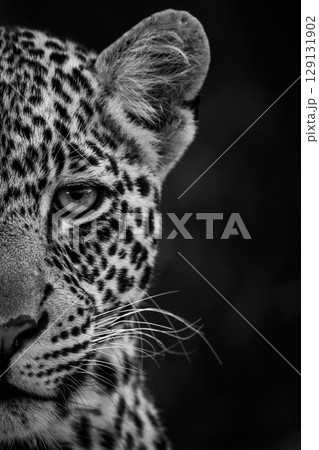 Mono close-up of leopard cub half face