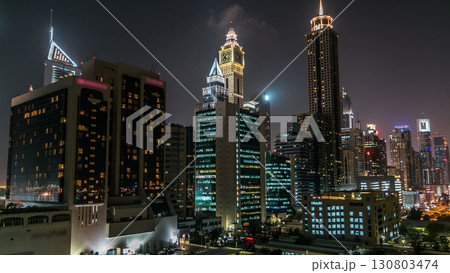 Downtown Dubai towers night timelapse. Aerial view of Sheikh Zayed road with skyscrapers.