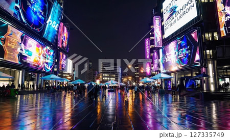 Wet pavement reflecting vibrant colors from digital advertising screens, illuminating urban nightlife in modern shopping district with pedestrians moving through futuristic cityscape
