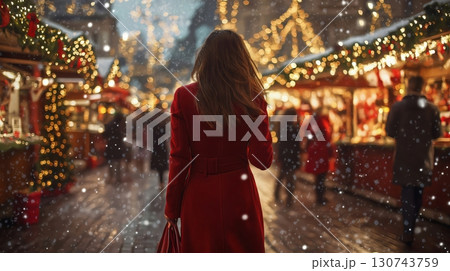 Woman is enjoying the atmosphere of a traditional Christmas market with falling snow