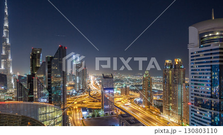 Dubai downtown skyline night timelapse with tallest building and Sheikh Zayed road traffic, UAE