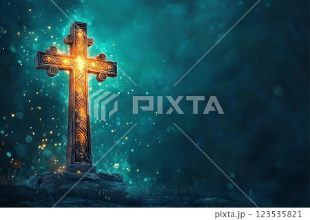 mystical celtic cross glowing with ethereal light against a dark teal background.