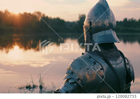 Medieval Knight in Armor Contemplating Serene Sunset by a Lake. Ai generative
