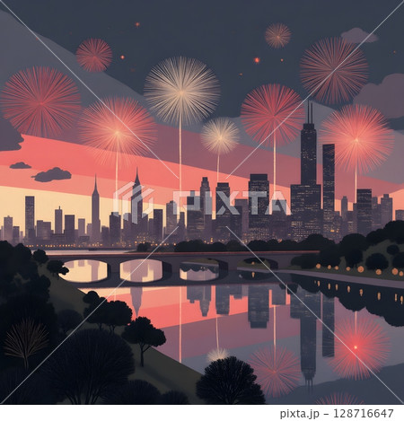 Colorful Fireworks Display Over City Skyline at Dusk with Reflections in Calm Water