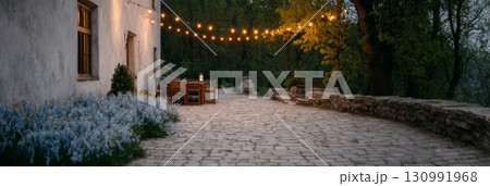A peaceful terrace adorned with white flowers and soft lights invites relaxation under the moonlight