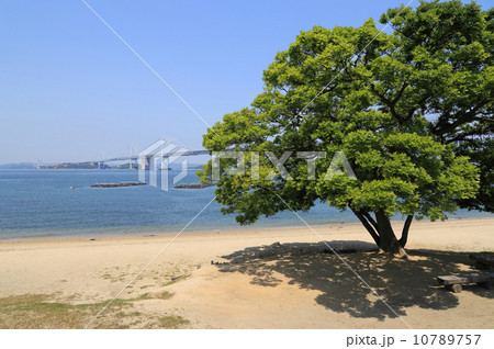 美しいエノキの大木、瀬戸内海と瀬戸大橋を背景に神秘の島、沙弥島、香川県坂出市、ナカンダ浜