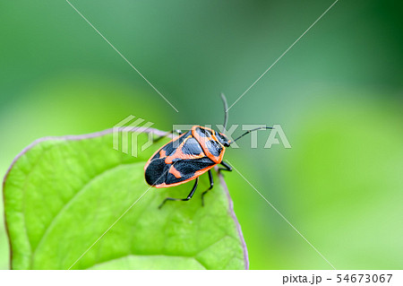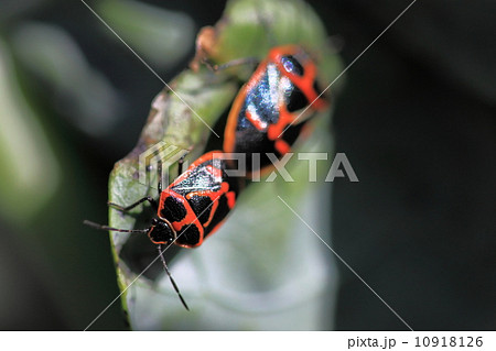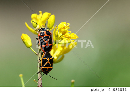 生き物 昆虫 ナガメ、黒地に赤や橙色の模様が映える美しいカメムシ。交尾中です