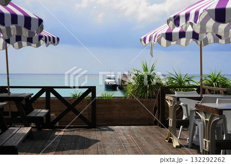 船の桟橋が見えるカフェ 10月沖縄本島424高速船と桟橋・ナガンヌ島