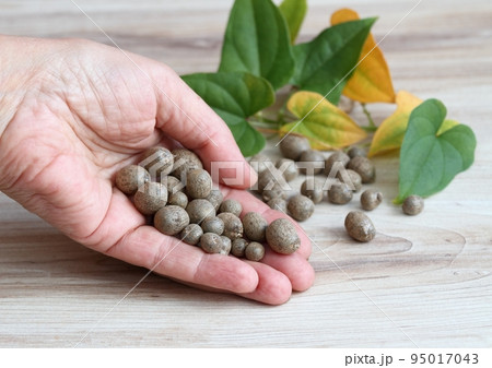 Bulbils harvested in autumn from Chinese yam, lat. Dioscorea opposita in gardener s hand