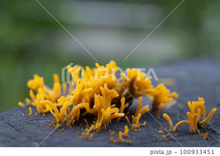 切り株に生えたオレンジ色のキノコ/ナギナタタケ・夏